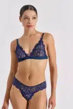 Γυναικείο σετ εσωρούχων που αποτελείται από δαντελένιο τρίγωνο bralette και ασορτί brazilian slip σε μια απίθανη απόχρωση midnight blue. Aπό ελαστική φλοράλ δαντέλα και φαρδύ λάστιχο κάτω από το στήθος για καλύτερο κράτημα. Κλείνει πίσω με κόπιτσα. Το σλιπ είναι φαρδύ στο πλάϊ και αγκαλιάζει απαλά τους γοφούς. Είναι διακοσμημένο μπροστά με σατέν φιογκάκι και χρυσαφί αξεσουάρ.