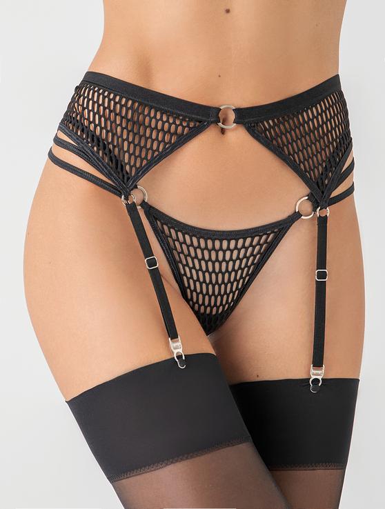 Ζαρτιέρα από χοντρό δίχτυ και μεταλλικούς κρίκους. Πίσω κουμπώνει με διπλή κόπιτσα τριών θέσεων. Οι ζαρτιέρες είναι ρυθμιζόμενες για καλύτερη εφαρμογή. Χρώμα : Μαύρο
