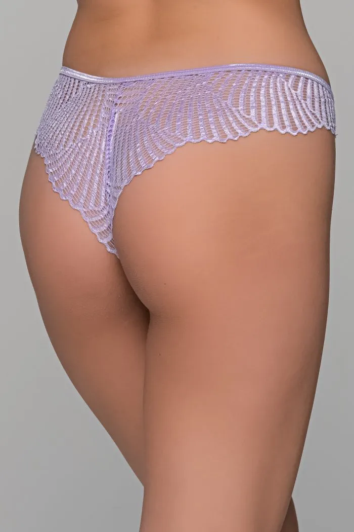 Brazilian slip με ύφασμα σατέν μπροστά και ελαστική δαντέλα πίσω σε ένα πολύ ιδιαίτερο σχέδιο που θυμίζει βεντάλιες. Με μεταλλικές λεπτομέρειες μπροστά. Εσωτερικά διαθέτει καβαλάκι από βαμβακερό ύφασμα για καλύτερη υγιεινή προστασία.